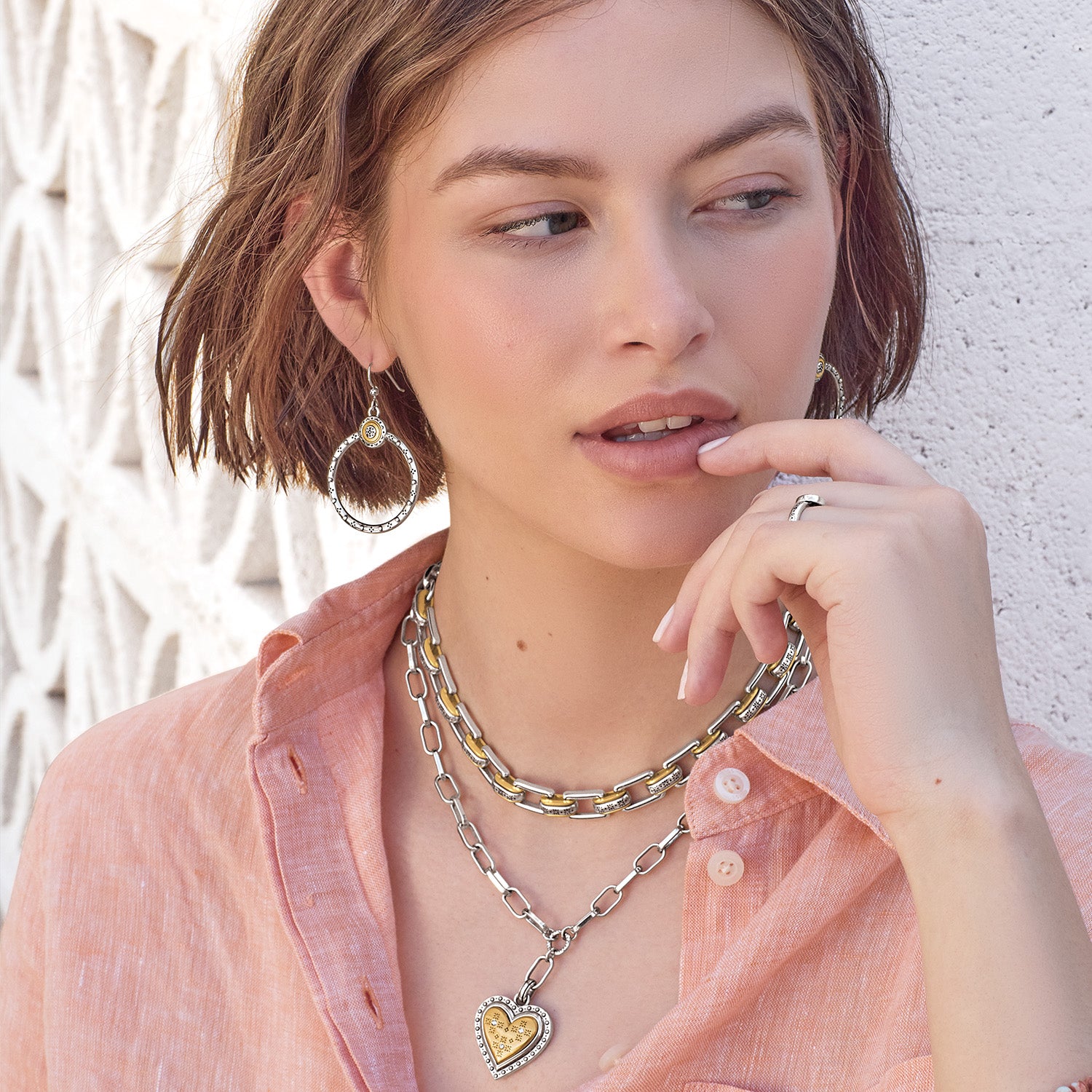 Forward-facing large 1 1/4” hoops feature a small round pendant with a gold inlay. The hoop itself is decorated with etched details and raised granulations. Fun, lightweight and swingy!