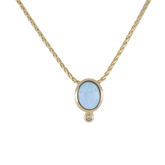 This elegant pendant is the perfect finishing touch to any look, featuring a magnificent oval-shaped blue opal exquisitely set within a Gold or Rhodium plated frame. With an adjustable 16-18” length chain, this luxurious and timeless piece is sure to add a touch of sophistication.