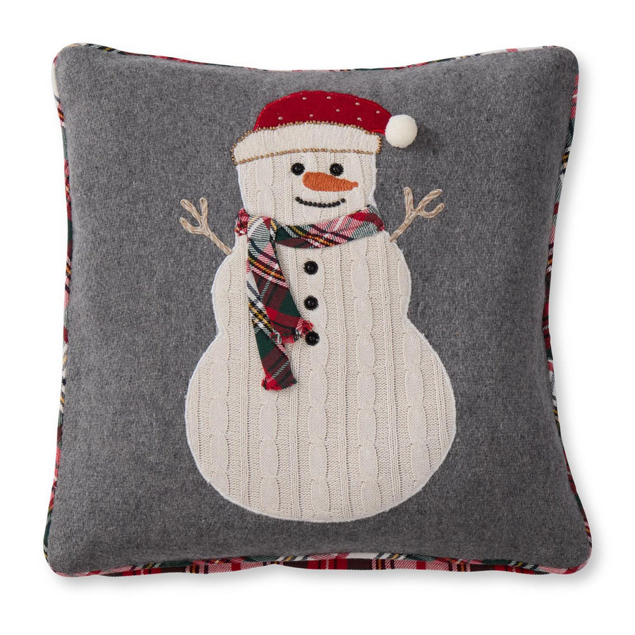 K & K Interiors Grey Wool & Cotton Pillow w/Knit Snowman & Tartan Scarf - 20"