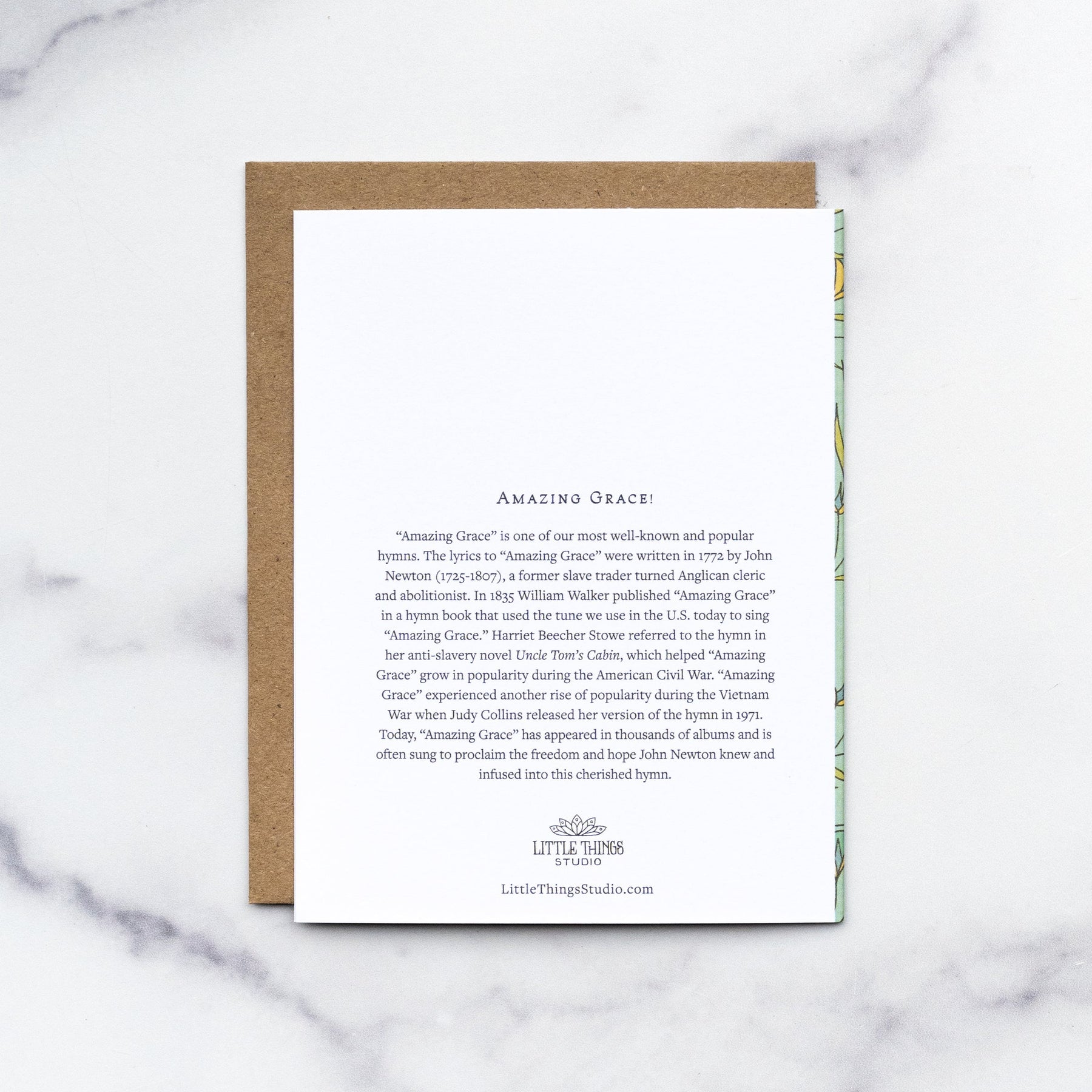 Want to send an uplifting message or encouraging note? The light green Amazing Grace hymn greeting card is the perfect way to say "I'm thinking of you" or "I care about you." Each card features a hymn's lyrics on the front and its history on the back. Designed and illustrated beautifully by Kate Whitley.